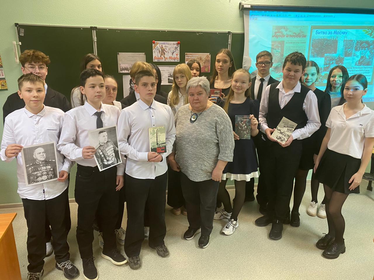5 декабря 2025 года исполнилось 84 года с начала контрнаступления советских войск под Москвой. Зимой 1941 года битва под Москвой изменила ход Великой Отечественной войны и стала отправной точкой долгого пути к Победе. В честь этого героического события для учащихся 8 А класса школы №4 сотрудники Центральной библиотеки им. С. Рафикова провели час истории с символическим названием «Мы под Москвой стояли насмерть». Ребята узнали о сражении за Москву, которое длилось почти шесть месяцев, о начале контрнаступления советских войск, мужественных защитниках столицы и о параде 7 ноября 1941 года на Красной площади, с которого солдаты отправлялись прямо на фронт. Школьники внимательно слушали о подвигах героев-панфиловцев, лётчика Виктора Талалихина, бойцов, подбивавших танки под командованием политрука Василия Клочкова. Особое впечатление на ребят произвёл рассказ о судьбе партизанки Зои Космодемьянской, зверски замученной и казнённой фашистами. Восьмиклассники продемонстрировали знания о ходе войны, её основных сражениях, отвечая на вопросы викторины. Ребятам были показаны видеоролики, посвященные битве за Москву, фрагмент фильма «Зоя». Мероприятие не оставило равнодушными школьников, они пришли к выводу, что необходимо знать и помнить события Великой Отечественной войны. Немеркнущая слава доблестных защитников Москвы будет вечно жить в памяти народа как образец мужества и героизма.