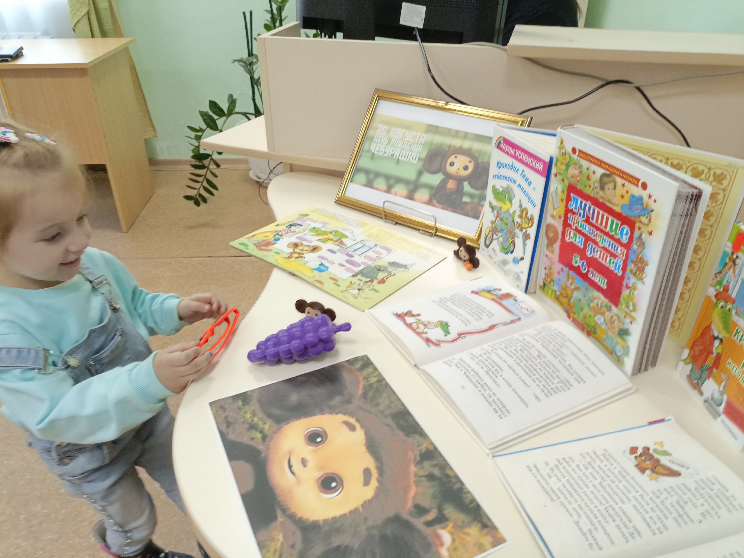В детском читальном зале центральной библиотеки в этот день было особенно оживленно.☺ Все потому, что проходил час литературного героя, посвященный дню рождения Чебурашки!🎉 Представляете, сколько радости было у ребят из детского сада «Колокольчик», которые пришли поздравить любимого персонажа?😃