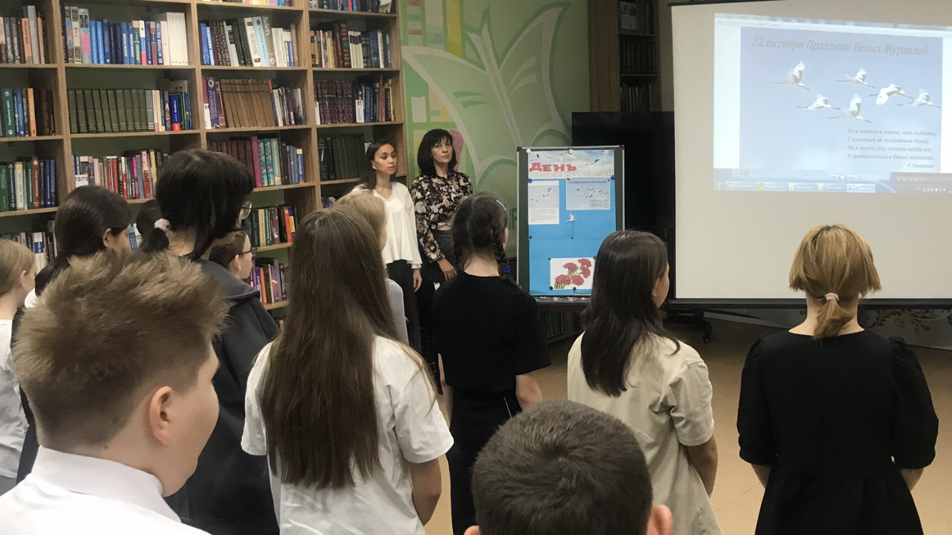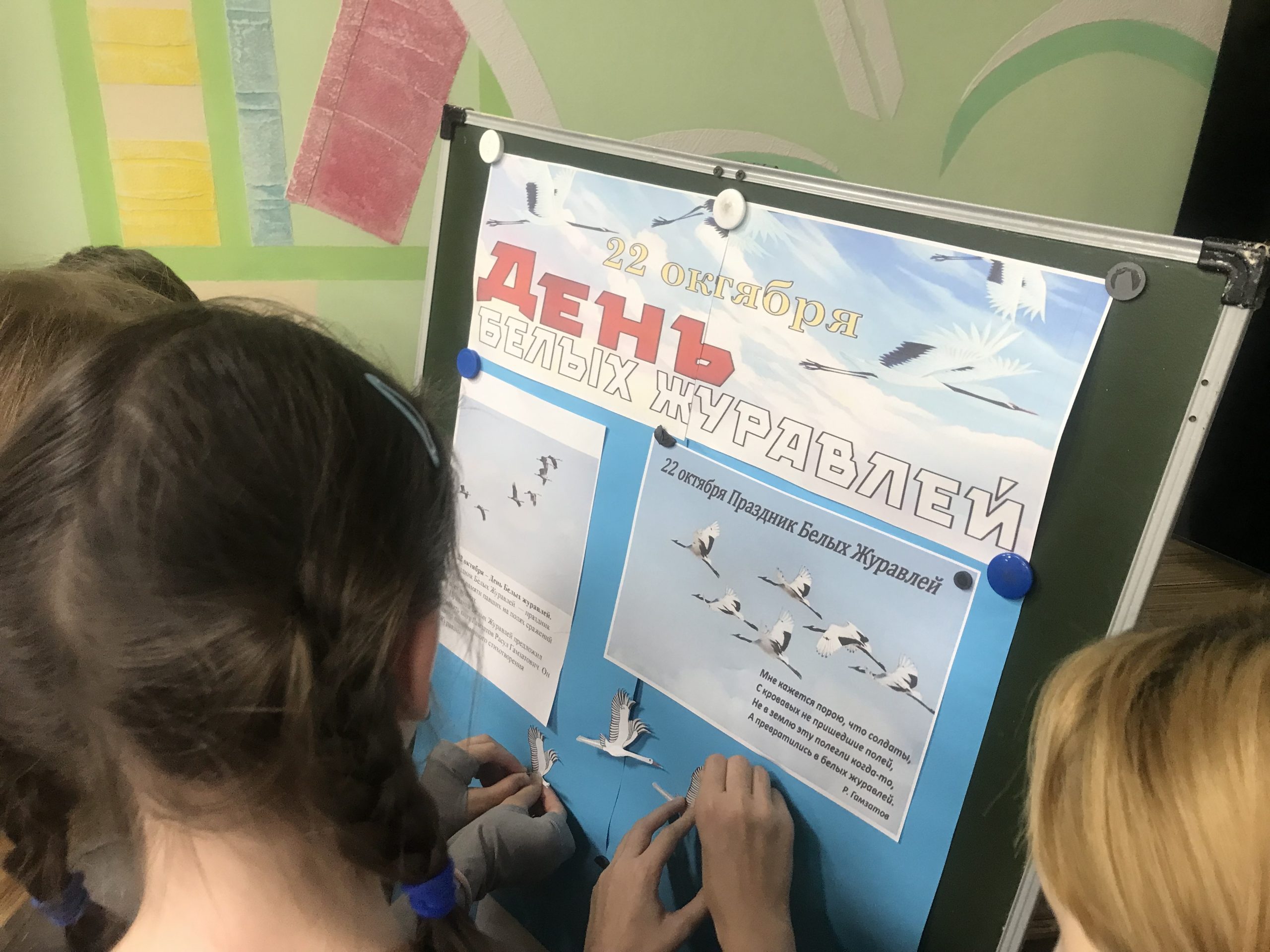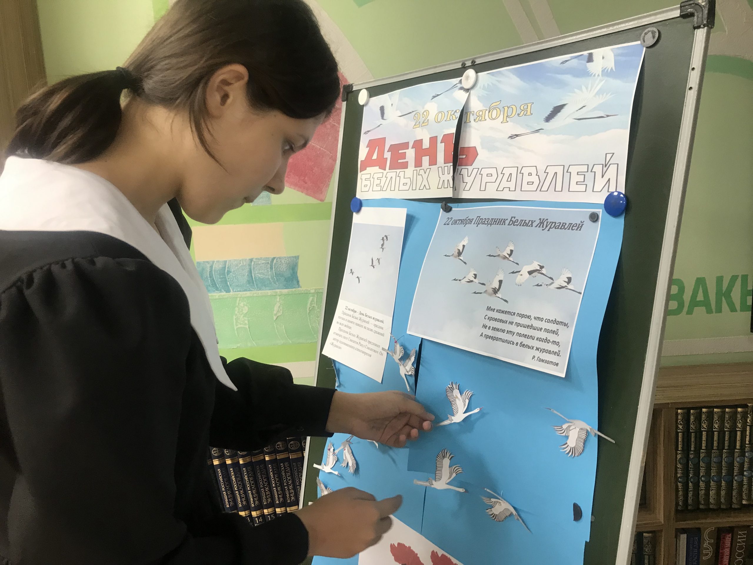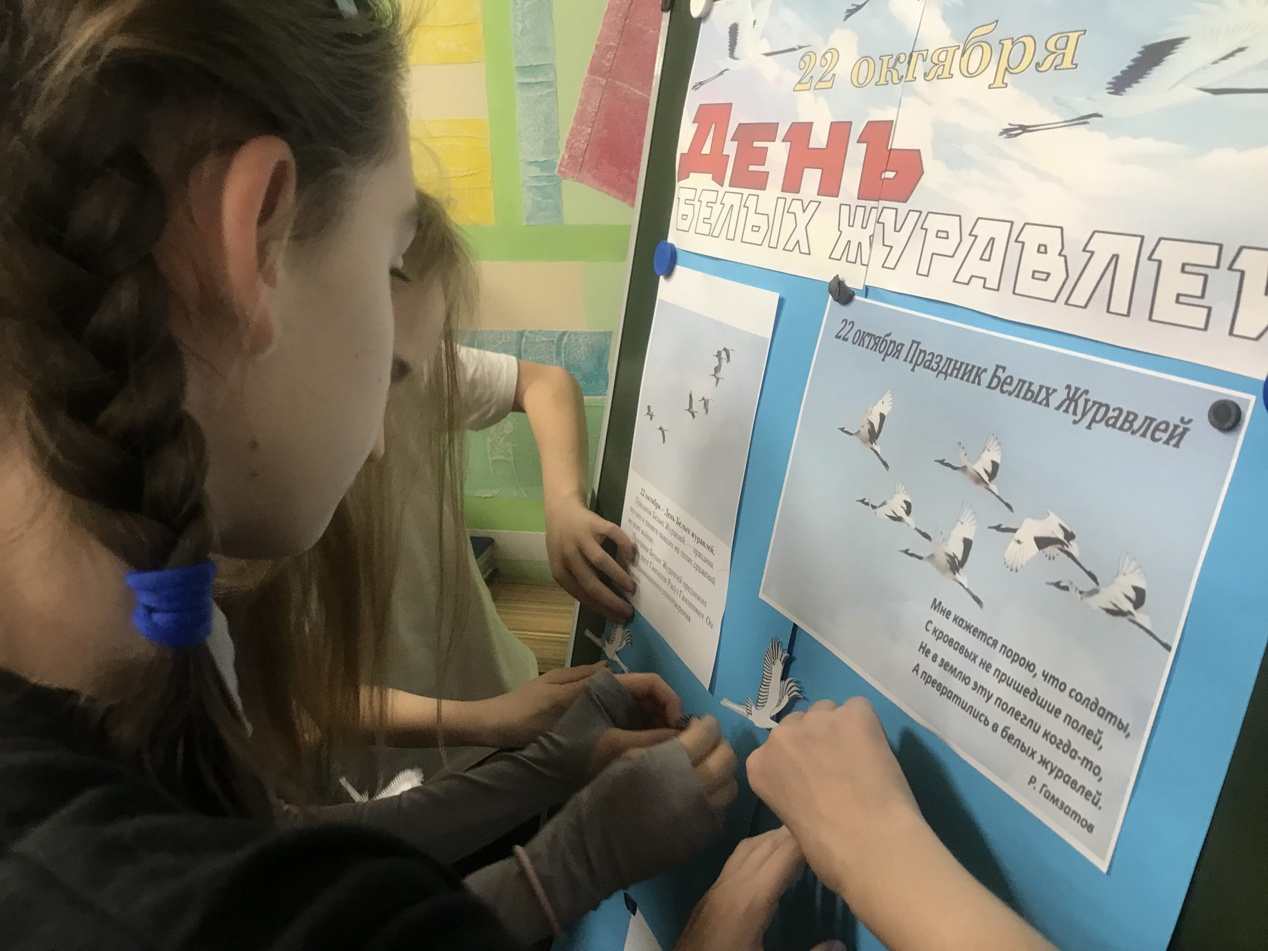 Также рассказали об установленных памятниках журавлям в разных уголках планеты. Учащиеся оформили плакат, посвященный стихотворению Расула Гамзатова «Журавли». На протяжении всего мероприятия звучали стихи, присутствующие просматривали кадры из кинофильма «Летят журавли» и слушали песню «Журавли».