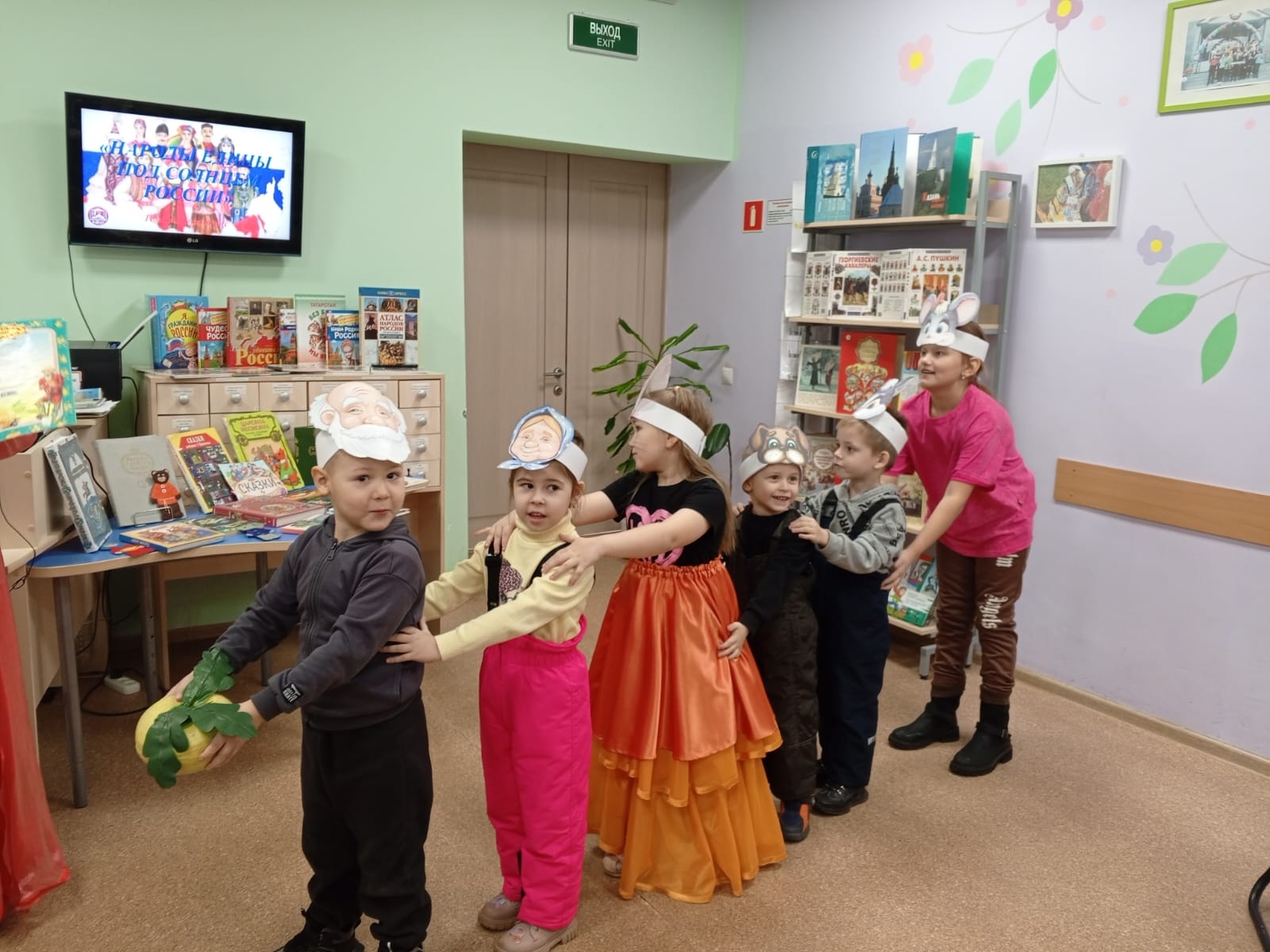 Завершился тематический час театрализованным представлением сказки «Репка». Юные зрители с удовольствием следили за развитием событий и стали участниками действа, помогая героям вытащить репку. В финале все участники мероприятия получили заряд бодрости и хорошего настроения, а также расширили свои знания об истории и культуре России.
