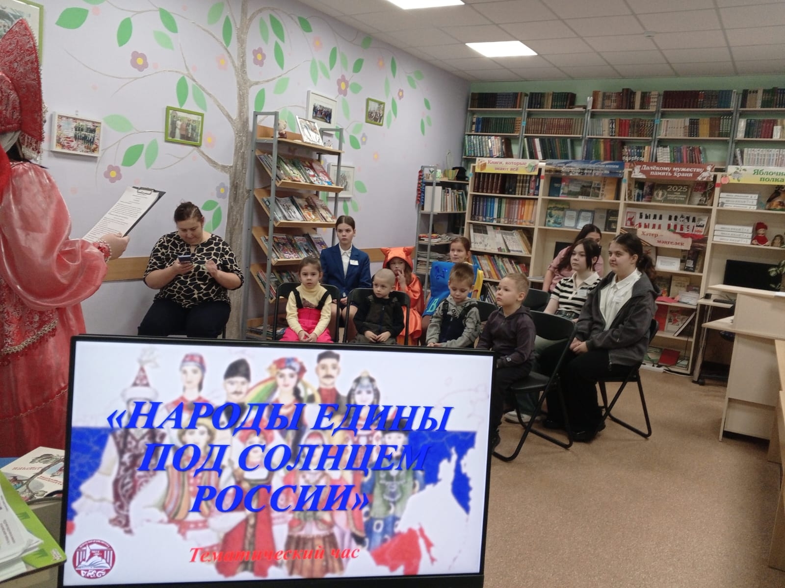 В детской библиотеке прошёл тематический час «Народы едины под солнцем России», посвящённый Дню народного единства. Гостями мероприятия стали воспитанники детского сада «Колокольчик» и активные читатели библиотеки.